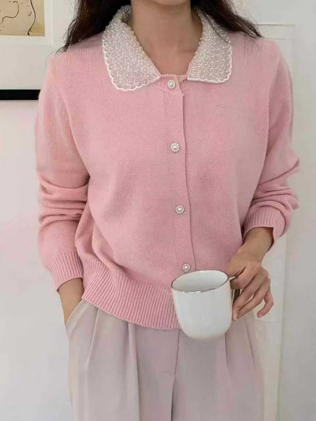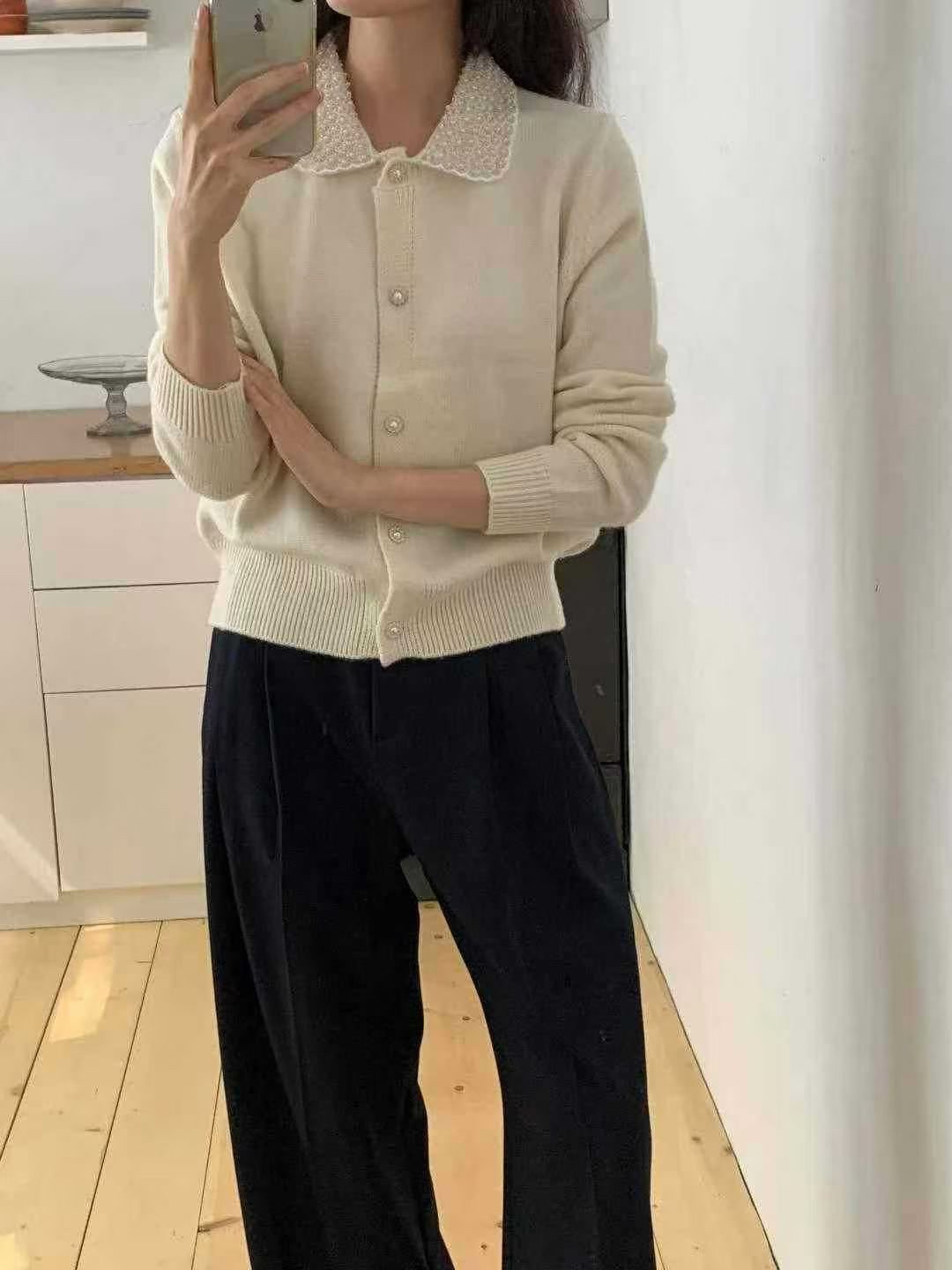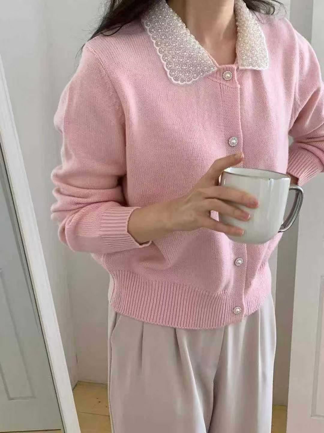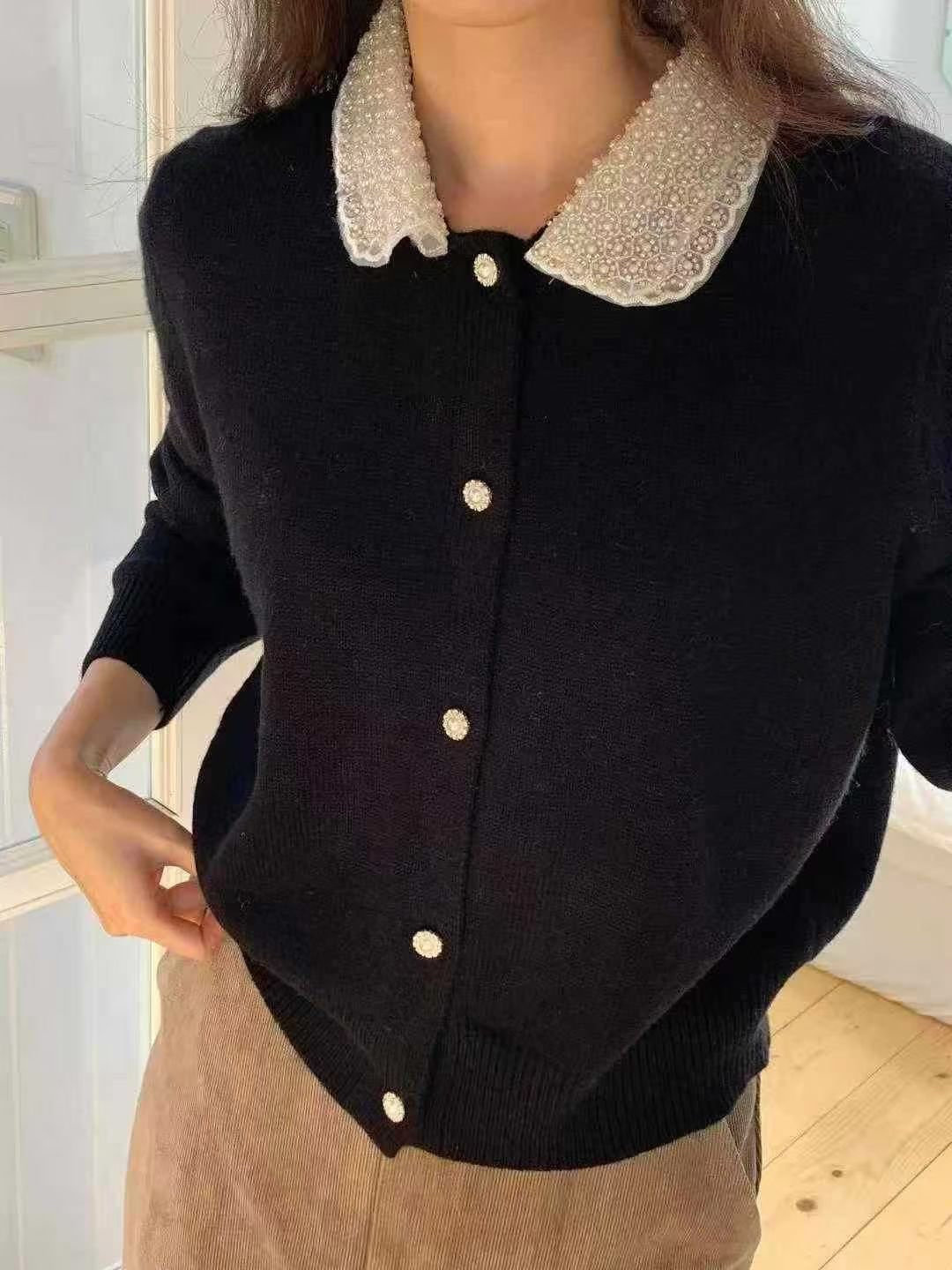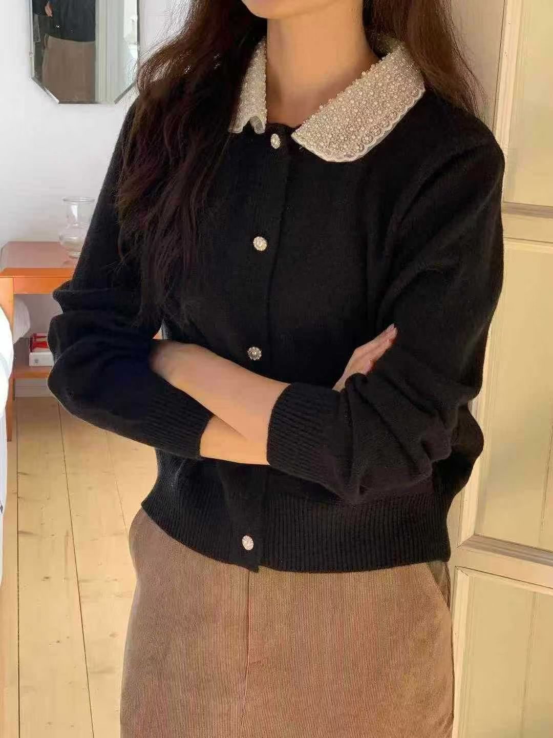 CT04 珍珠領Cardigan 4色 米/粉/灰/黑 Chest 44" length 21.5"