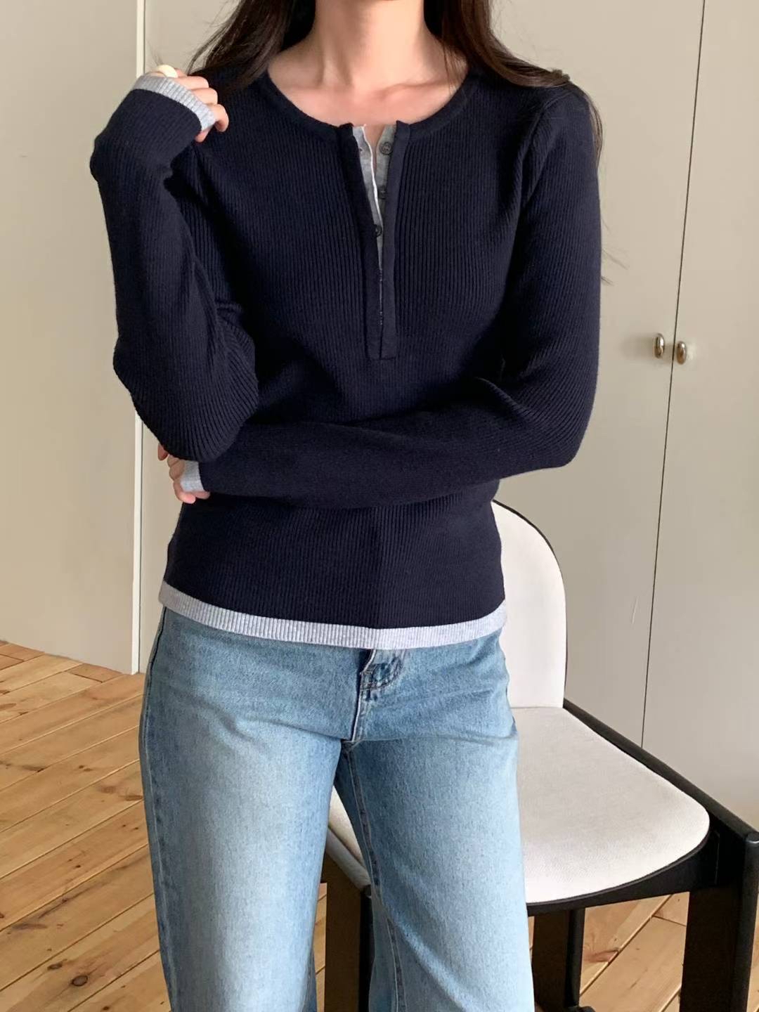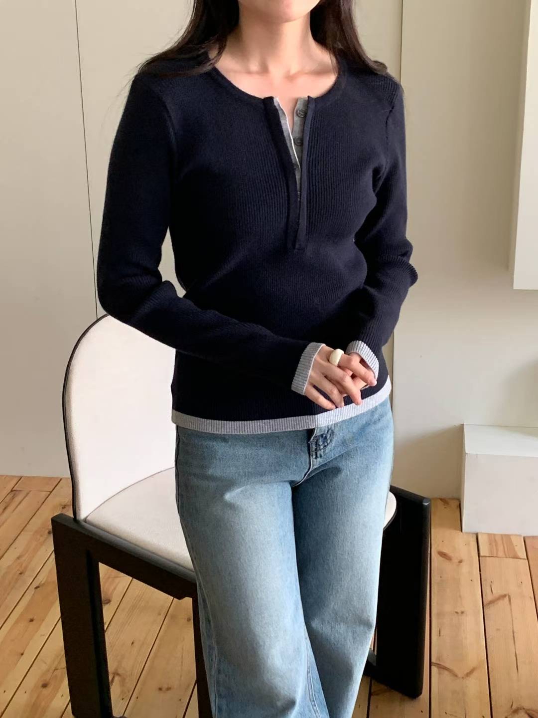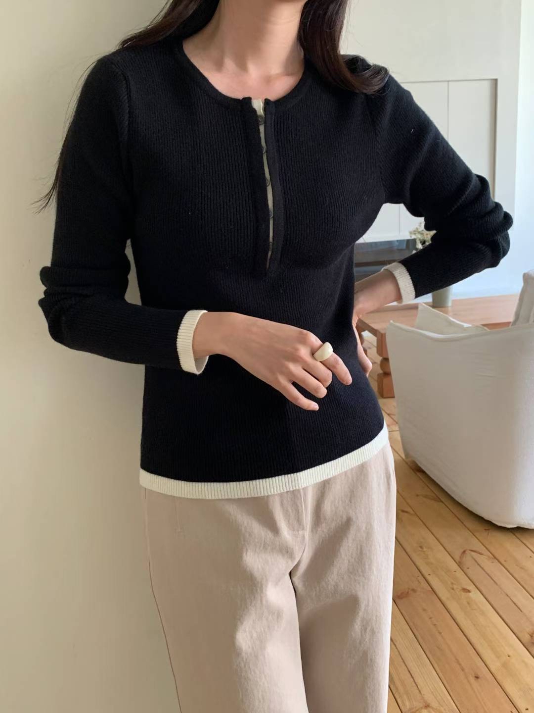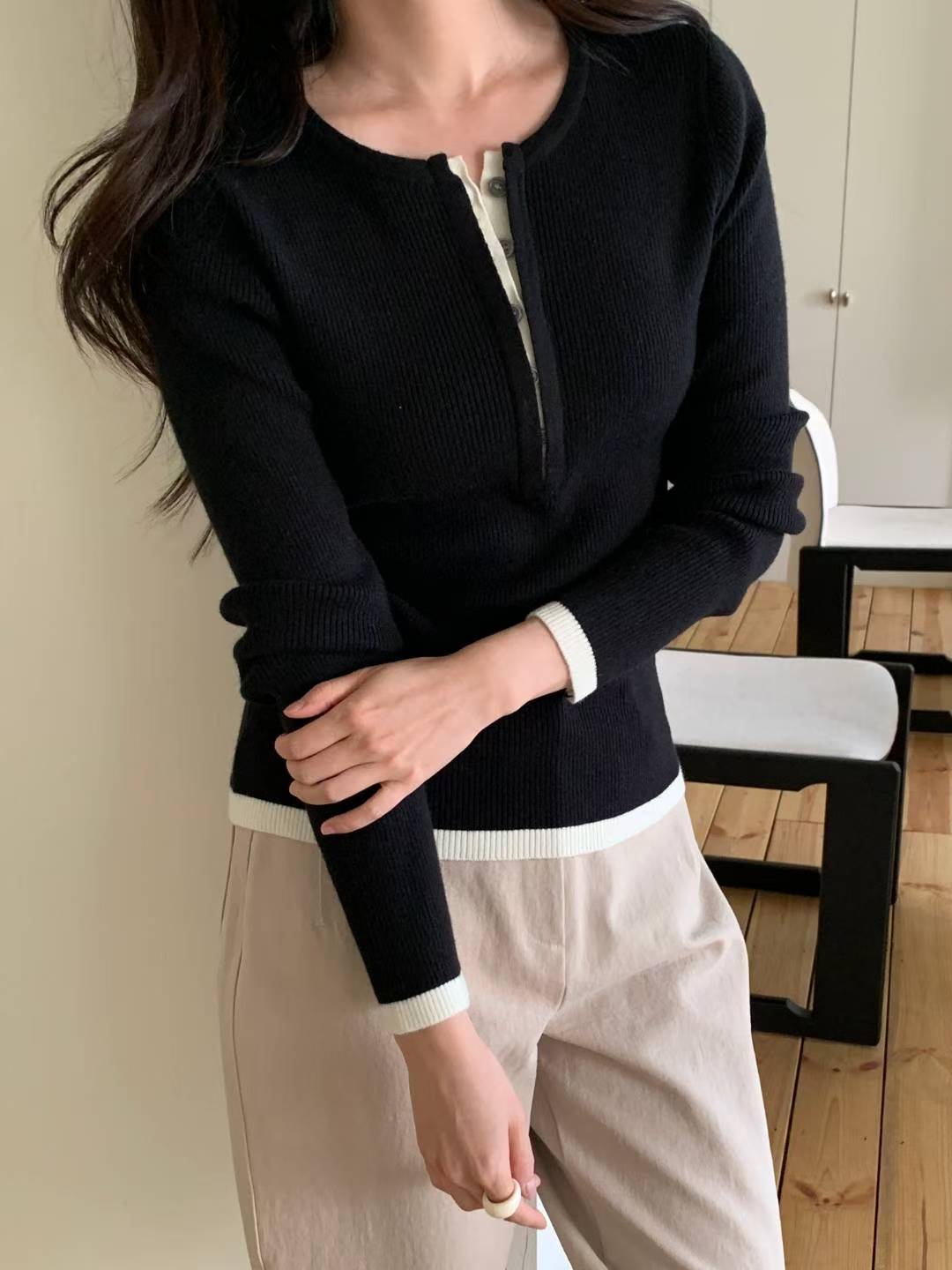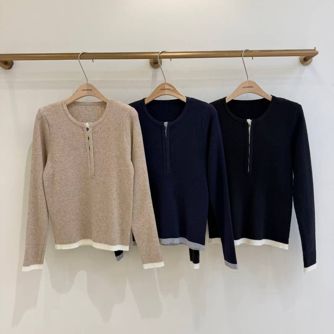 CT14 開鈕拼色針織Top
