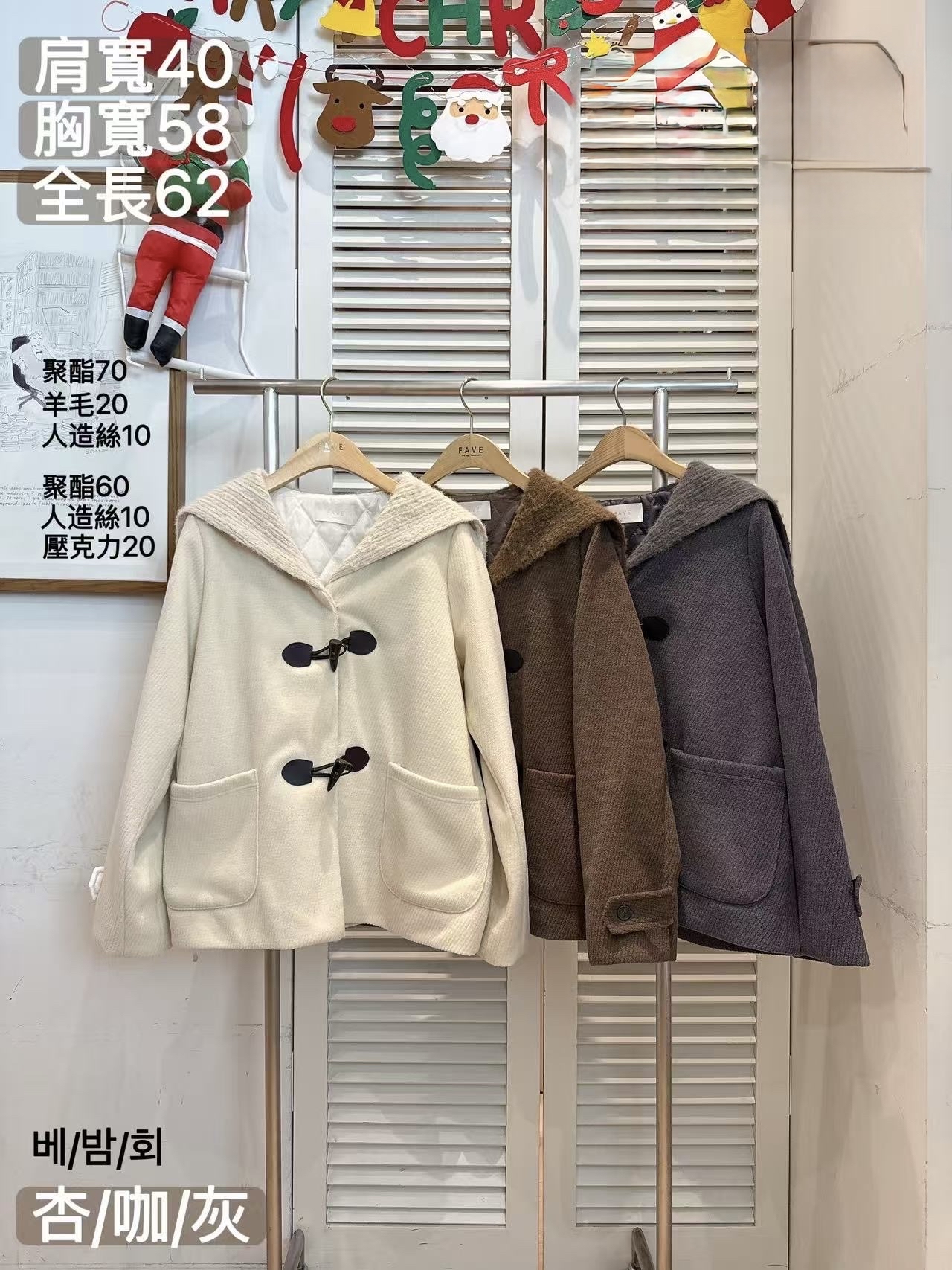 FV30牛角鈕大領羊毛外套 (20%羊毛) 3色 杏/啡/灰 Shoulder 15.7" chest 45" length 24.5"