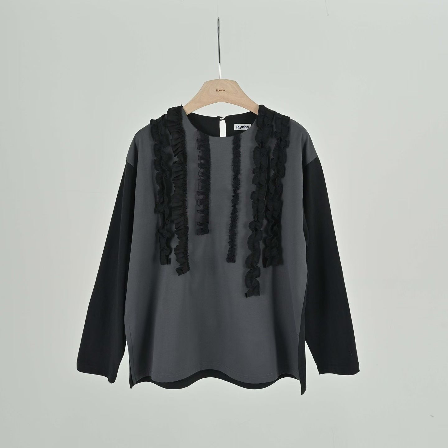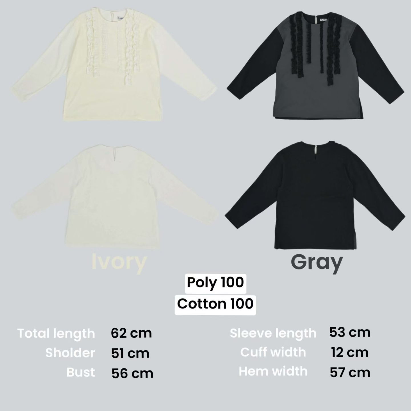 RB01 Ruffle 花邊blouse 2色 米白/灰黑 Shoulder 20" chest 44" length 24.5" sleeves 20.8"