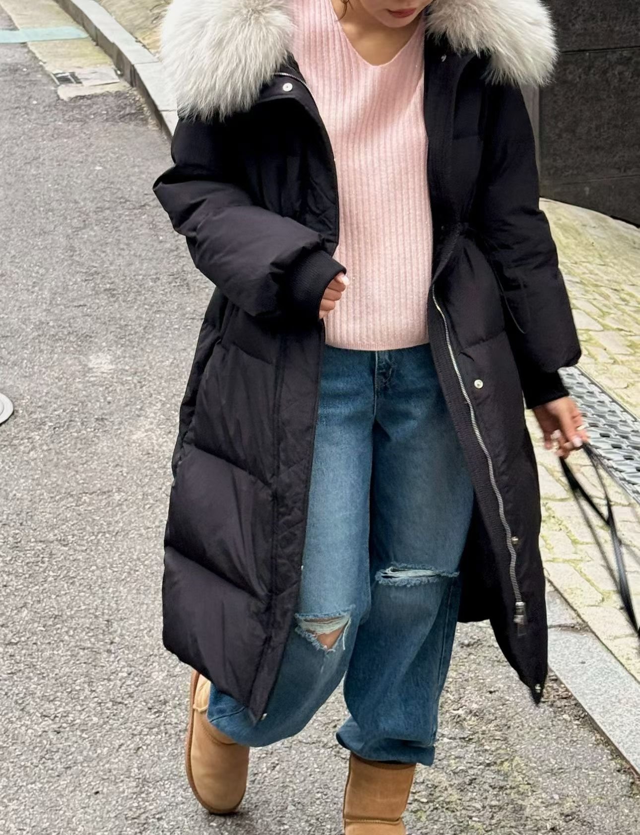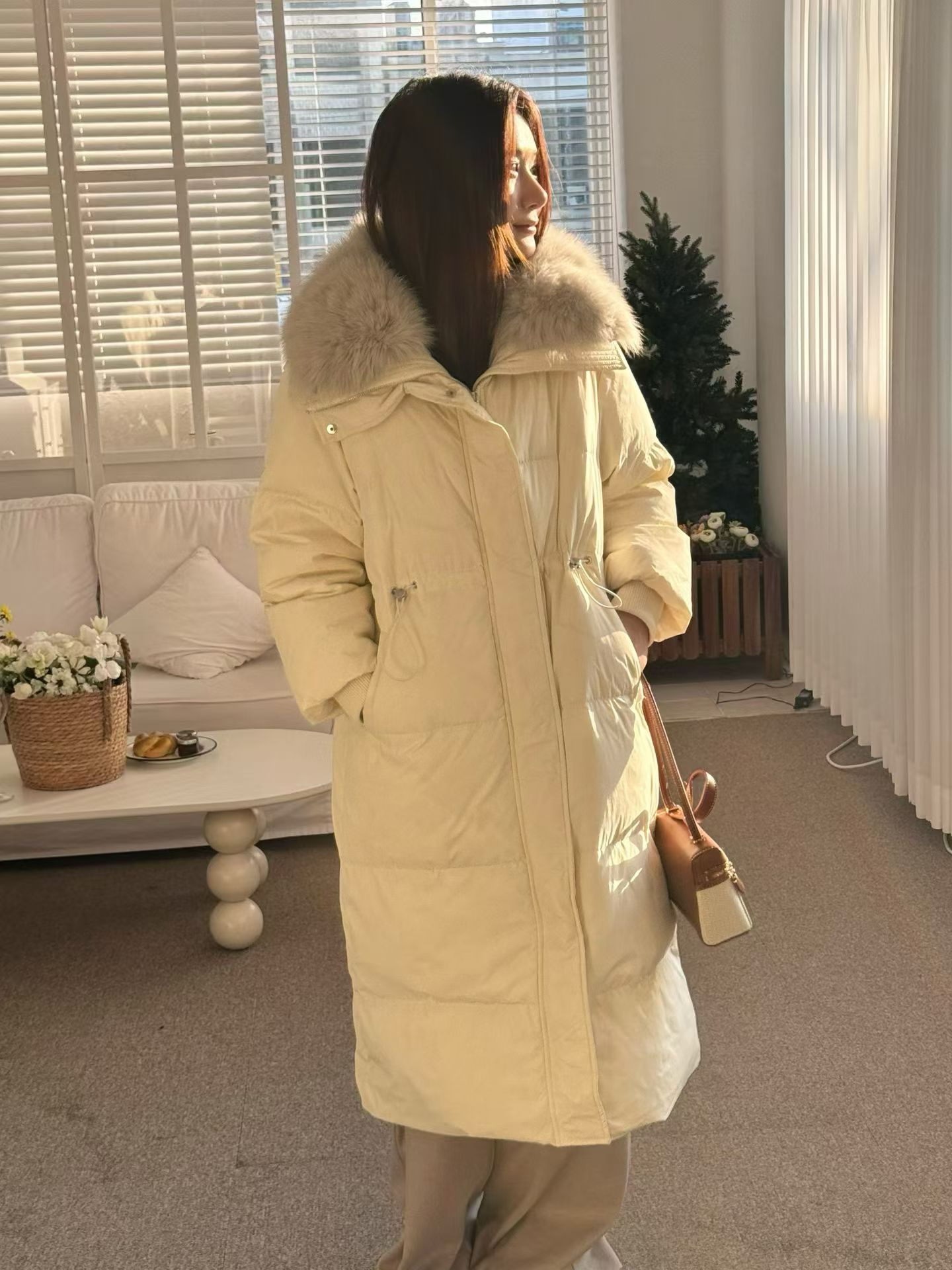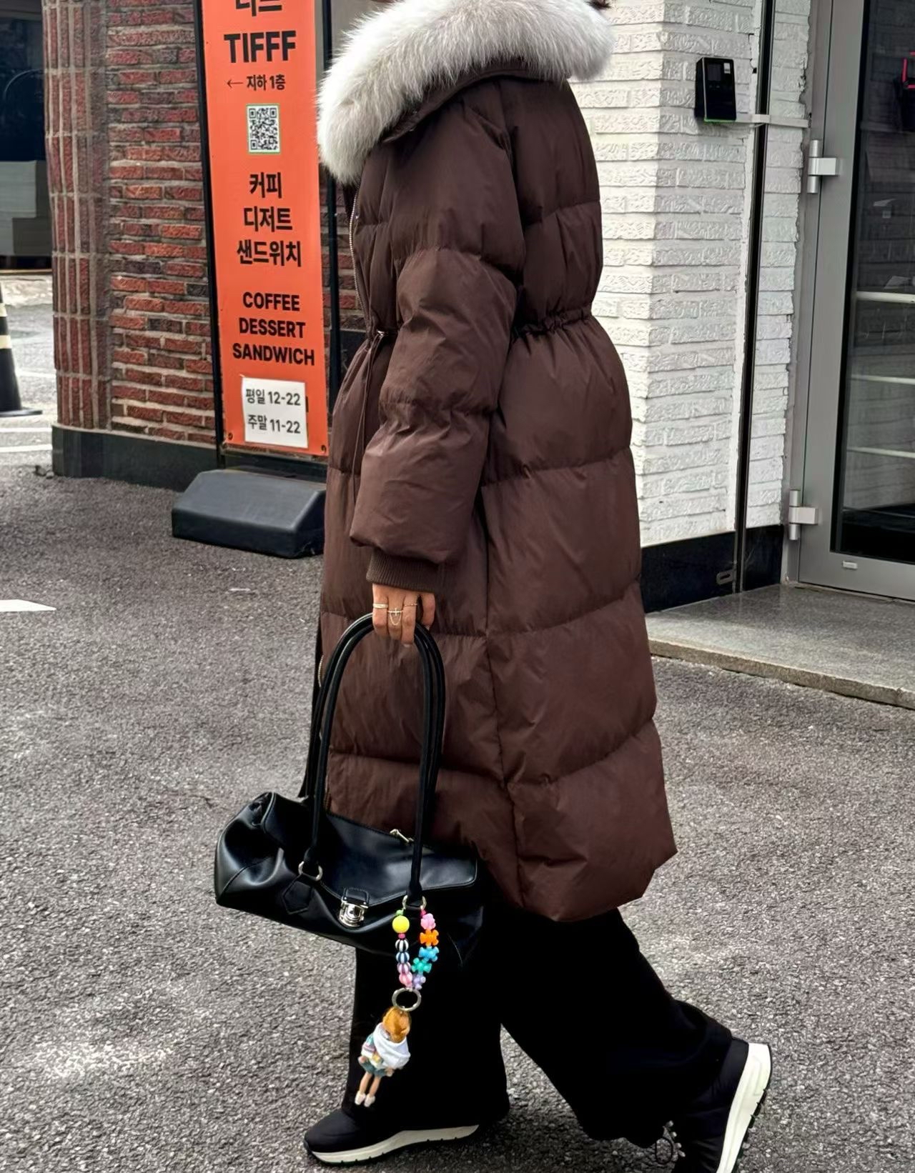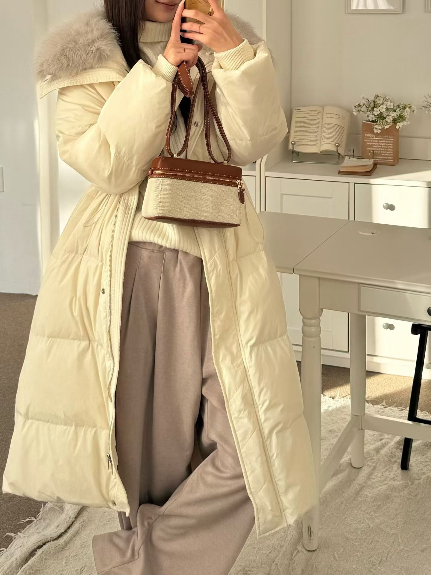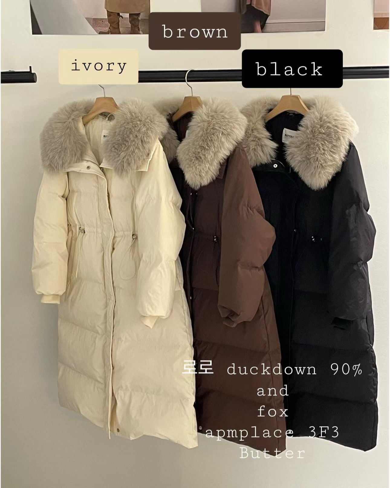 BT11 狐狸毛束腰長羽絨 90% duck down 3色 米/啡/黑