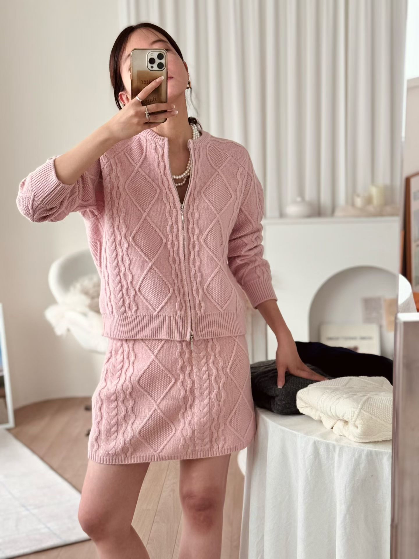 BT33 麻花拉鏈外套+裙set 2色 粉/灰 Chest 44" length 21.5" Skirt 23-40" hip 34-40" length 16"