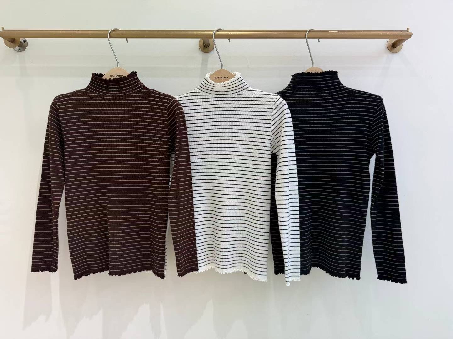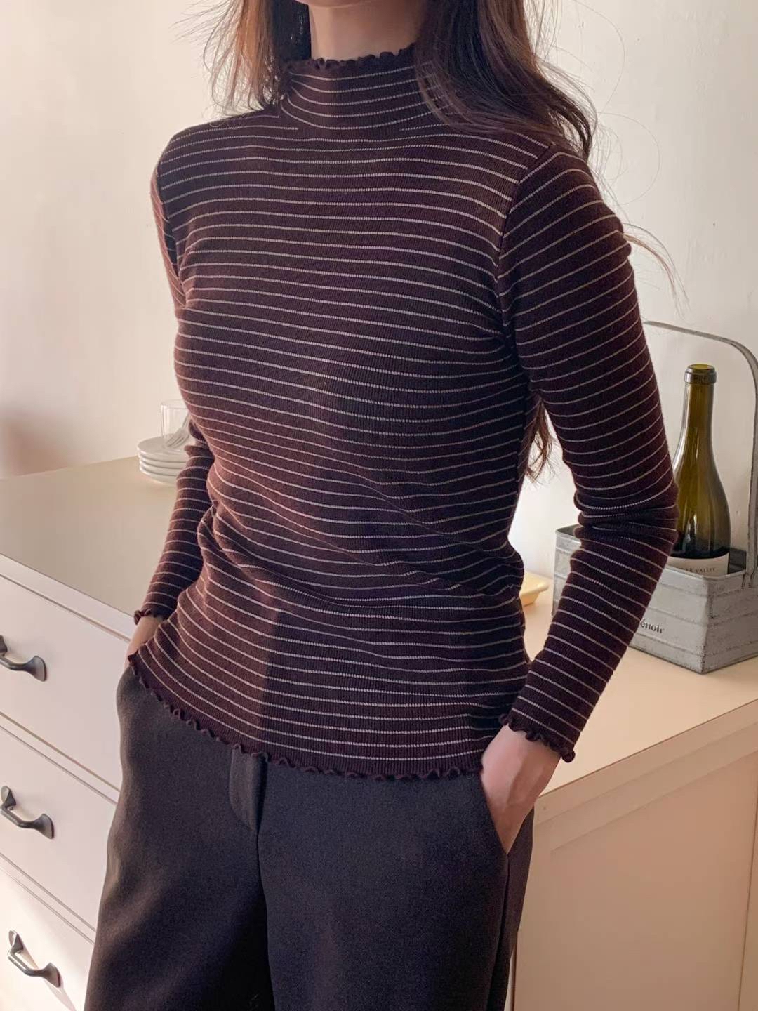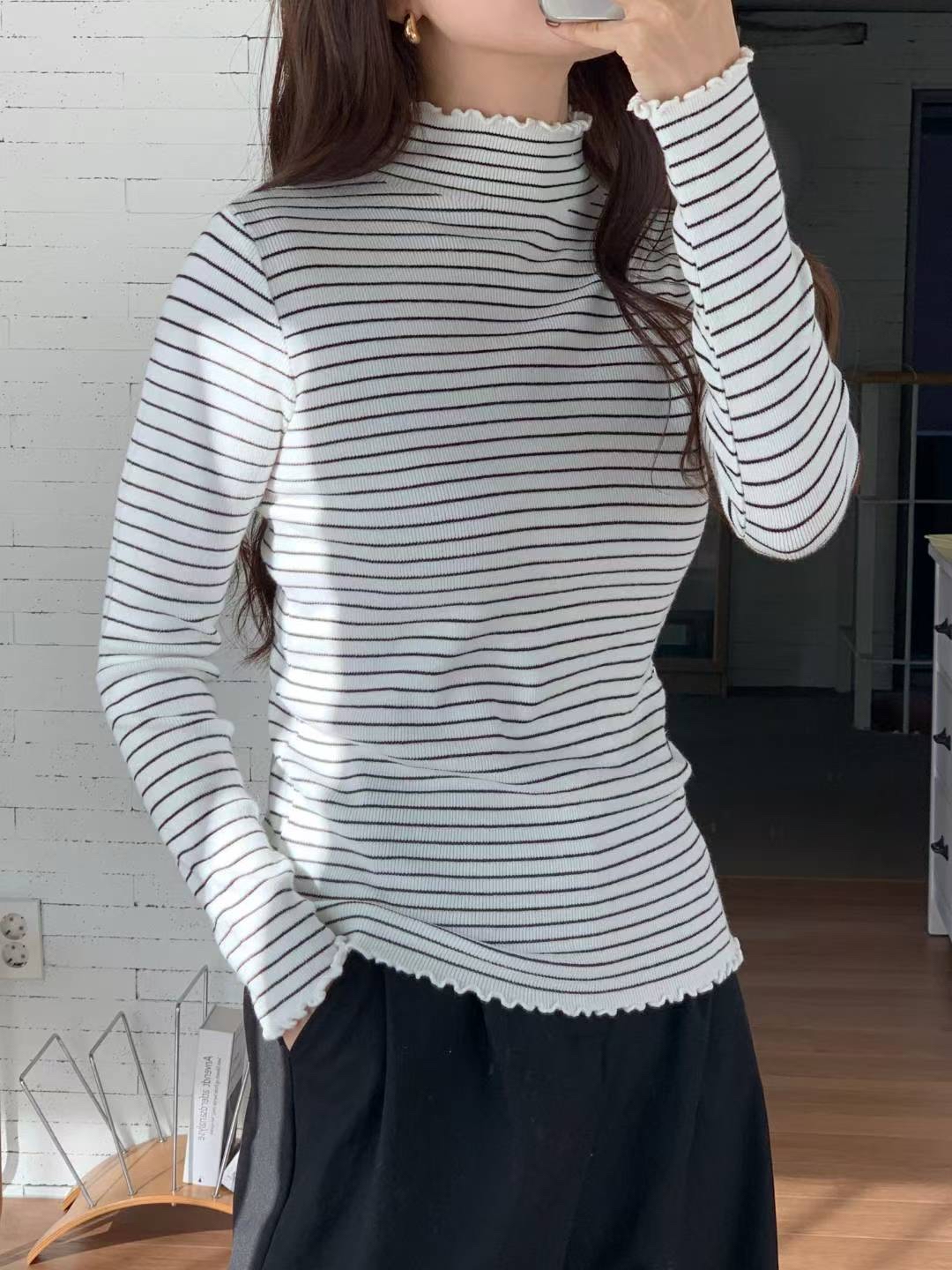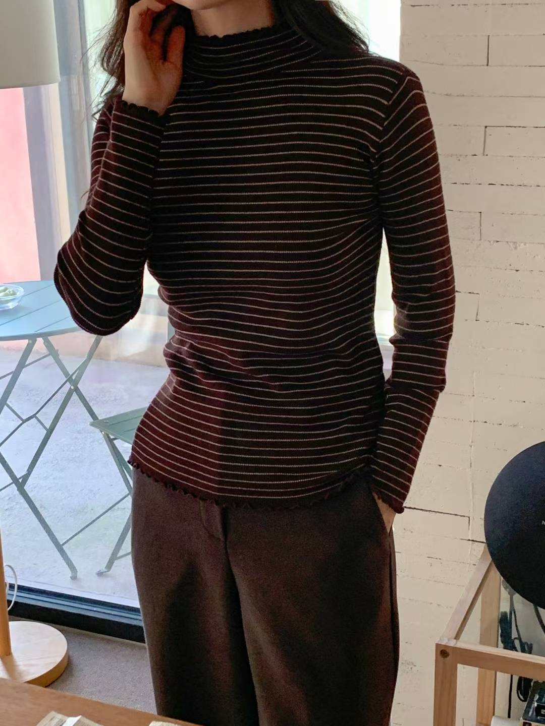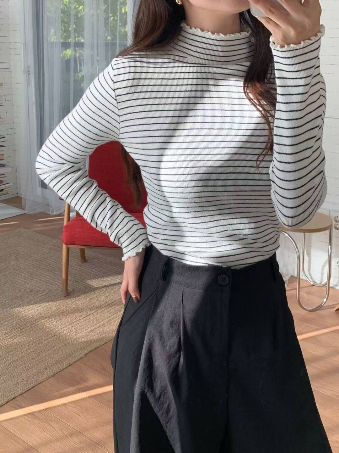 CT04 高領木耳邊間條彈性Top 3色 啡/米/黑 Chest 32-50" length 22.5"