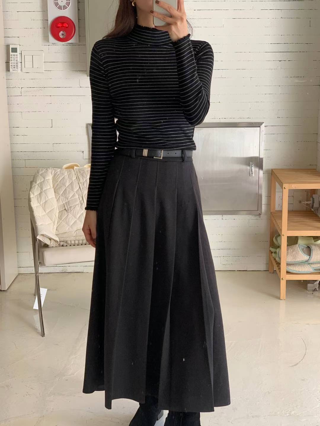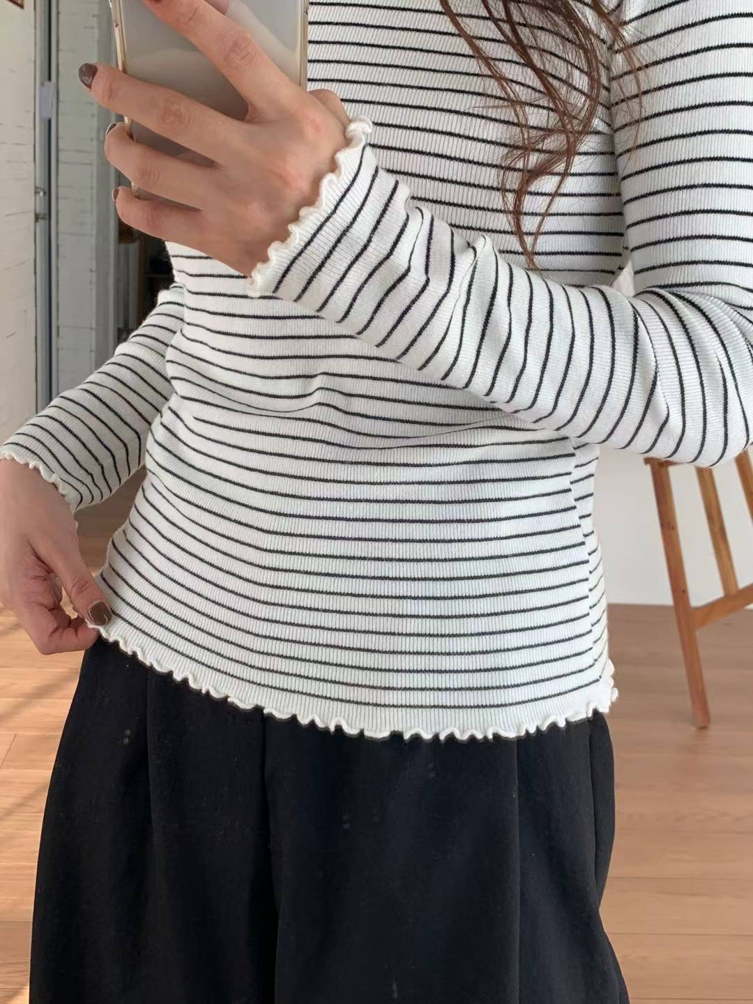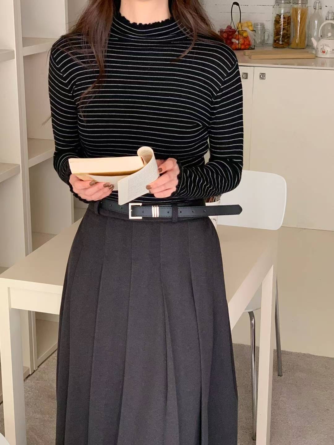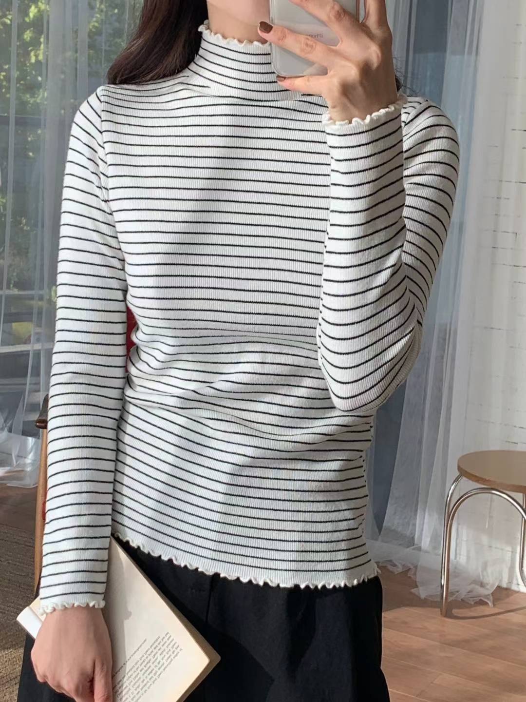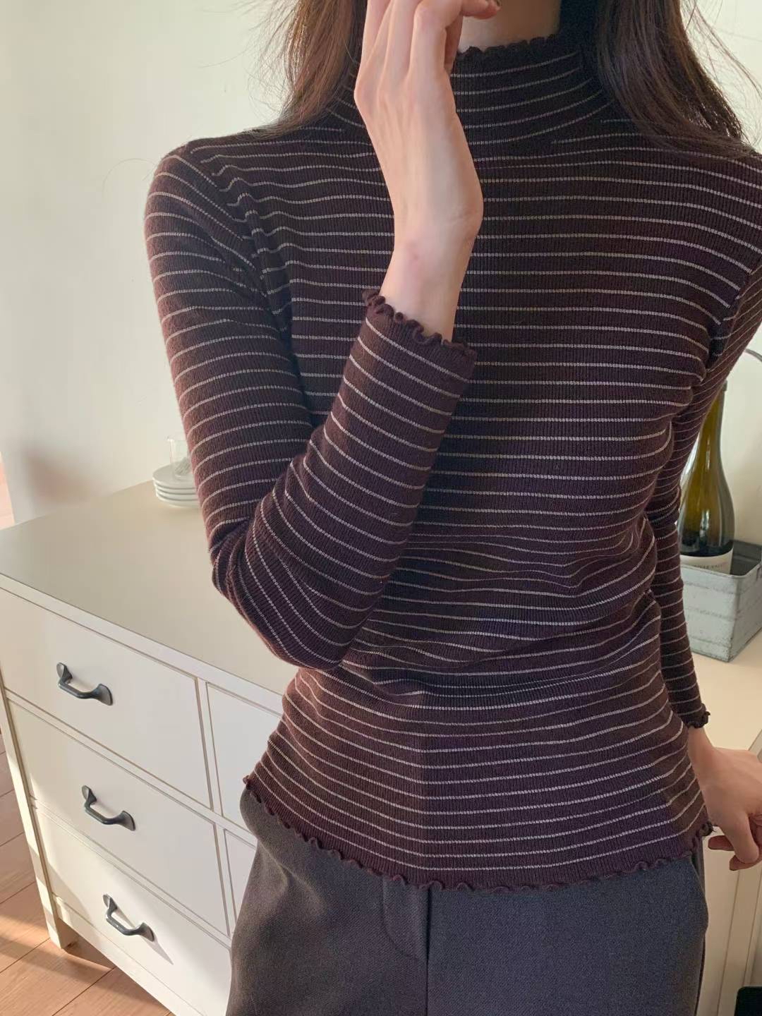 CT04 高領木耳邊間條彈性Top 3色 啡/米/黑 Chest 32-50" length 22.5"