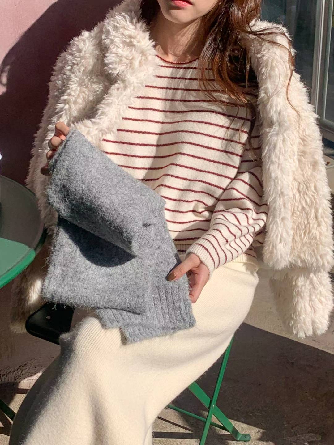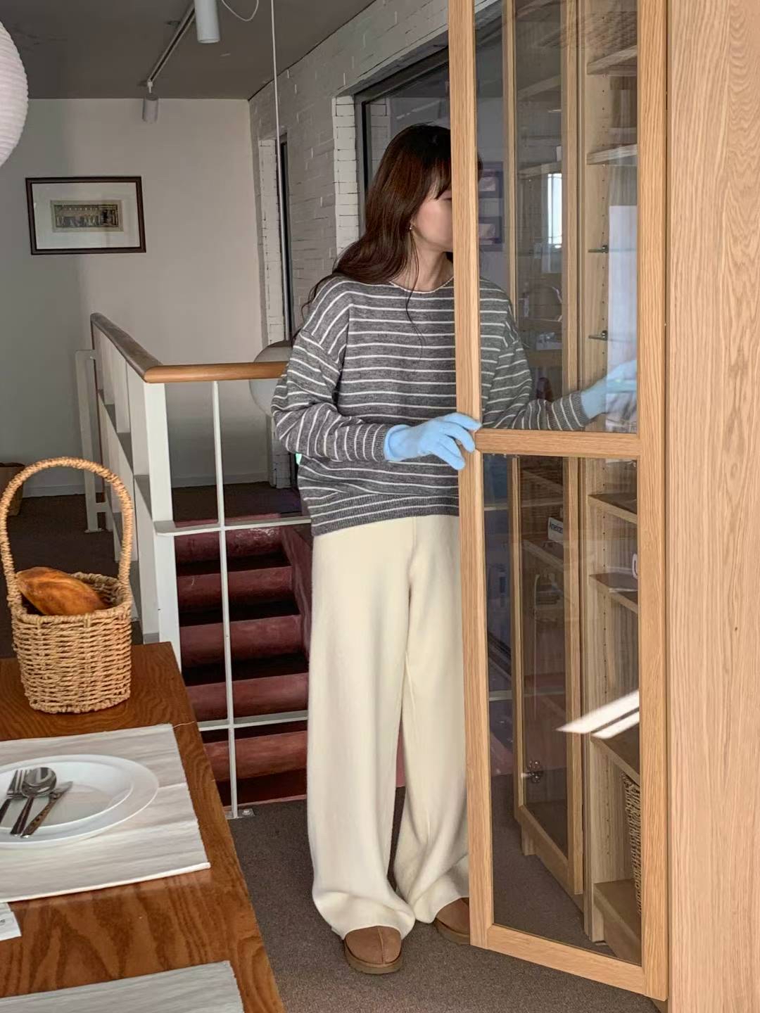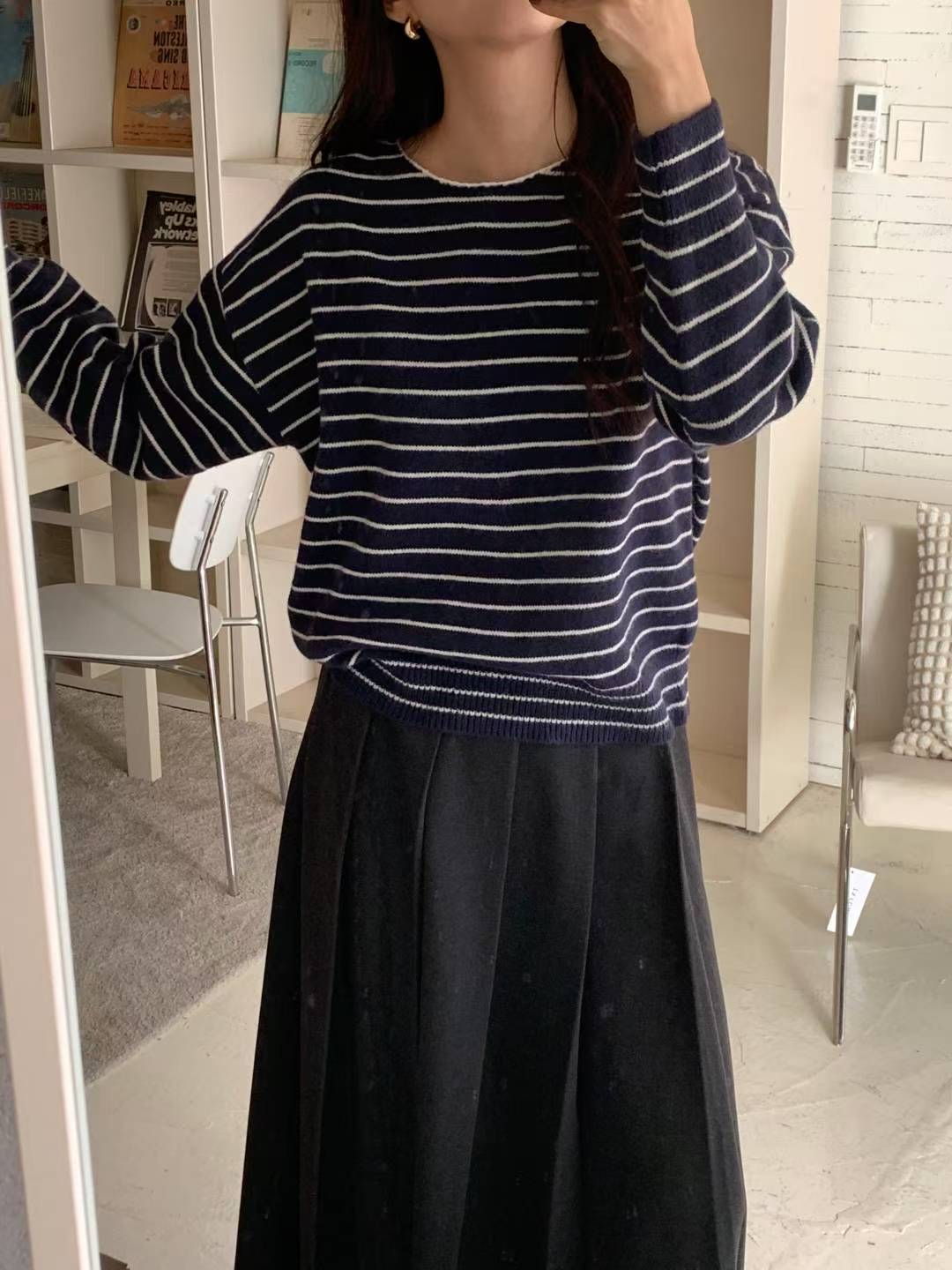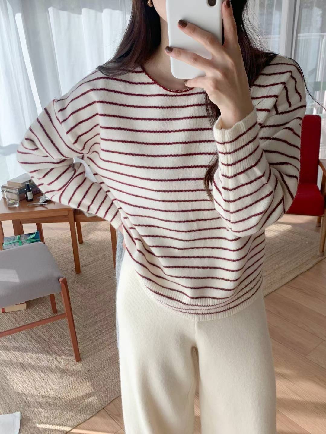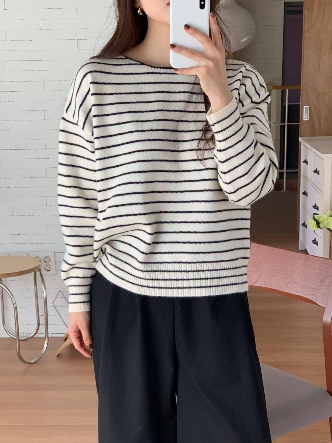 CT07 大圓領間條Top 4色 米/灰/燕麥/深藍 Chest 44-70" length 23.5"