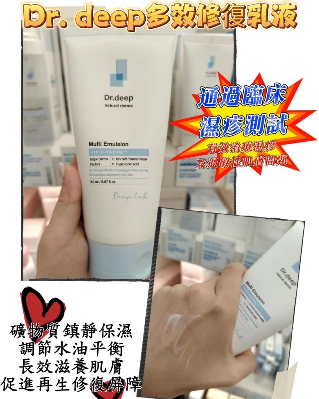 💰299 (150ml) 知道好多美女都有濕疹問題🥲 我都係! 我好容易皮膚敏感, 成日會無啦啦生風疹 /粒粒! 搵左呢枝 Dr Deep 多效修護乳液 比大家! 有效治療濕疹, 過敏性肌膚問題! 佢有礦物質鎮靜保濕,仲可以調節水油平衡 長效滋潤肌膚, 促進再生修護屏障! 質地不黏不笠! 但保濕度極高! 適合當晚霜使用👍🏻👍🏻👍🏻