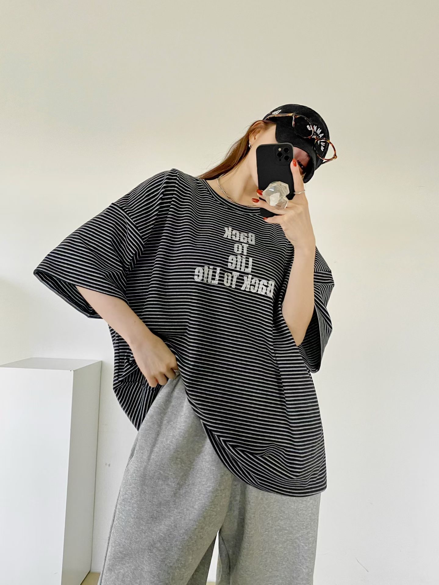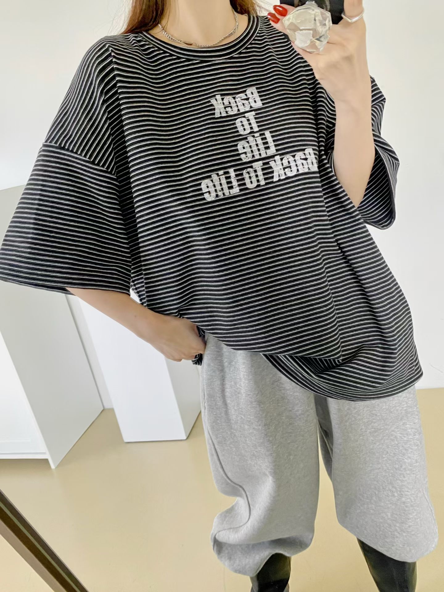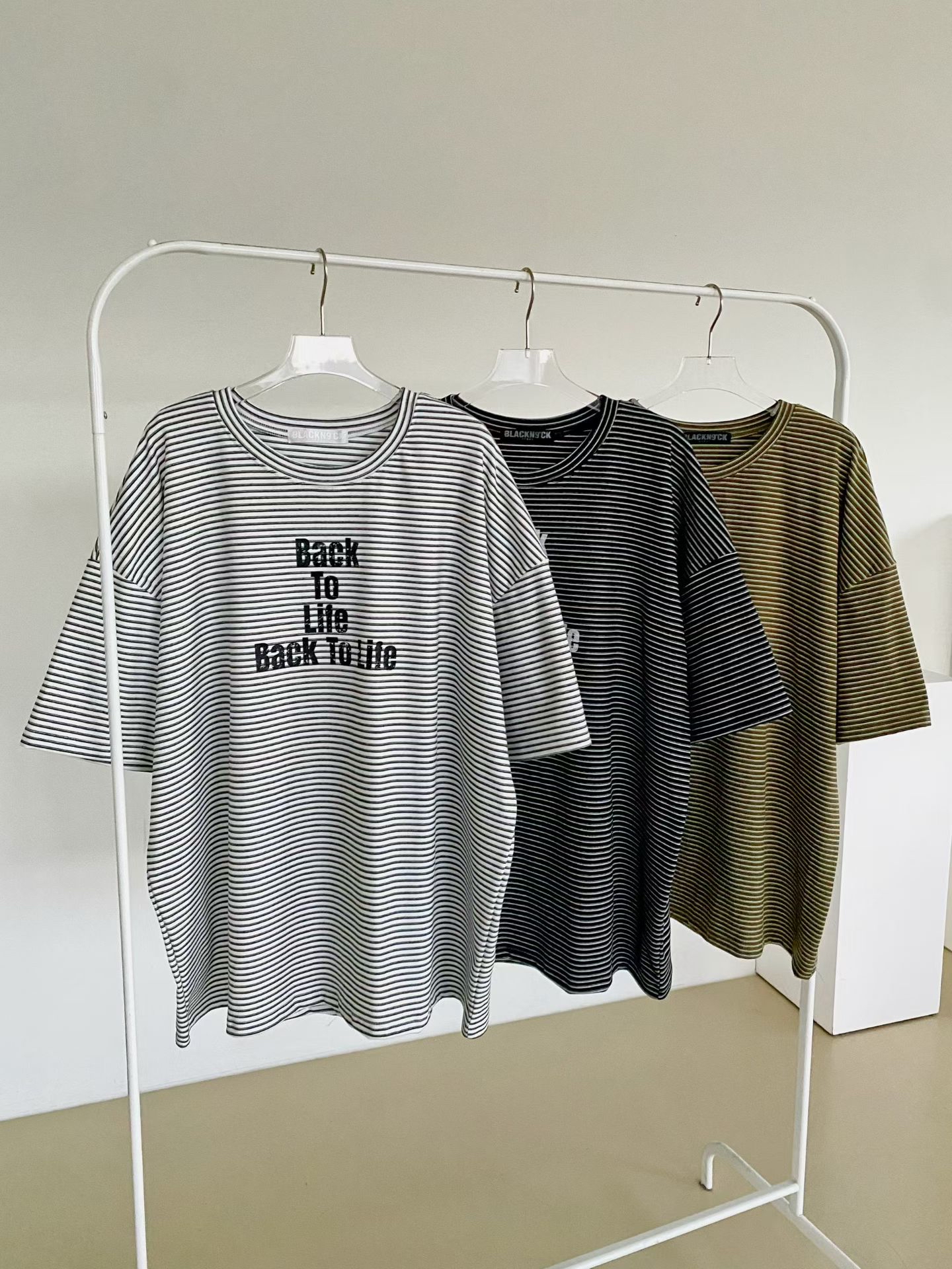 NB12 英文字間條Tee 3色 米/黑/卡其 Chest 52" length 28.5"